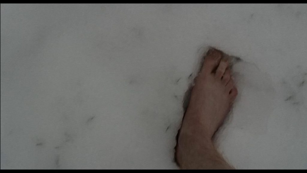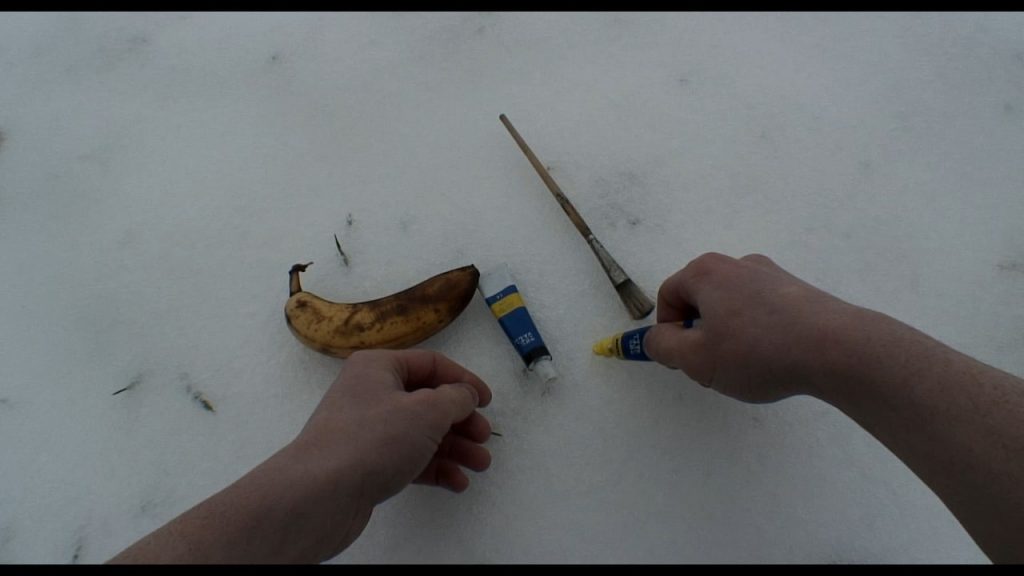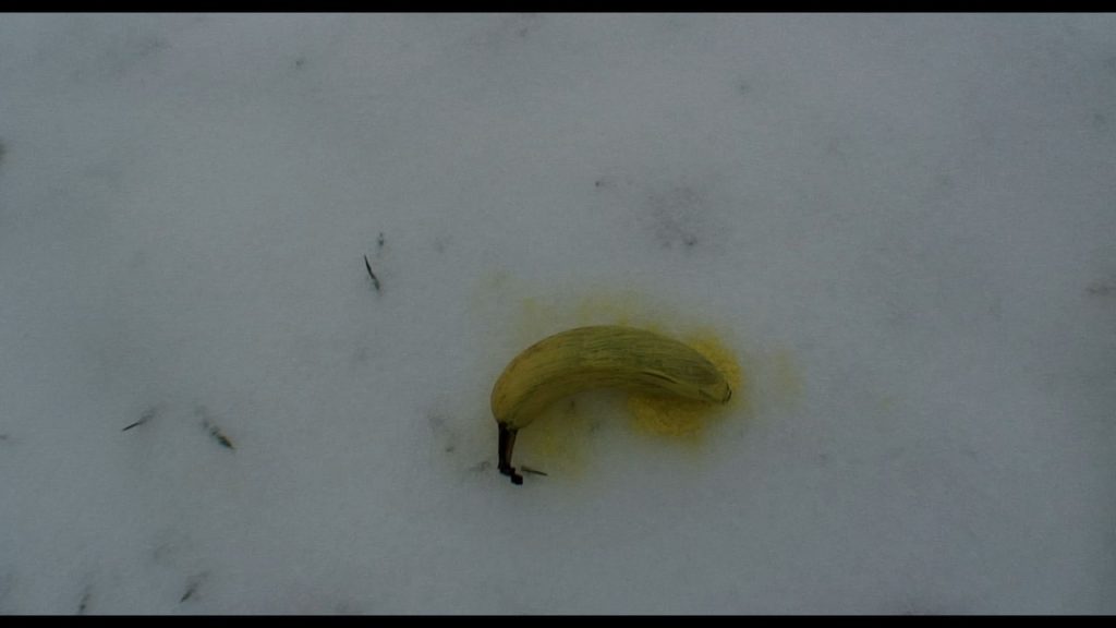 Es bricht sich einer durch gefrorenen Schnee zu einer Banane, die er gelb bemalt.